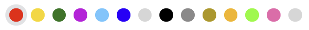 (rdeča, rumena, zelena, vijolična, svetlo modra, temno modra, bela črna, srebrno siva, zlata, neonsko oranžna, neonsko zelena, neonsko roza, fosforescentna barva)
